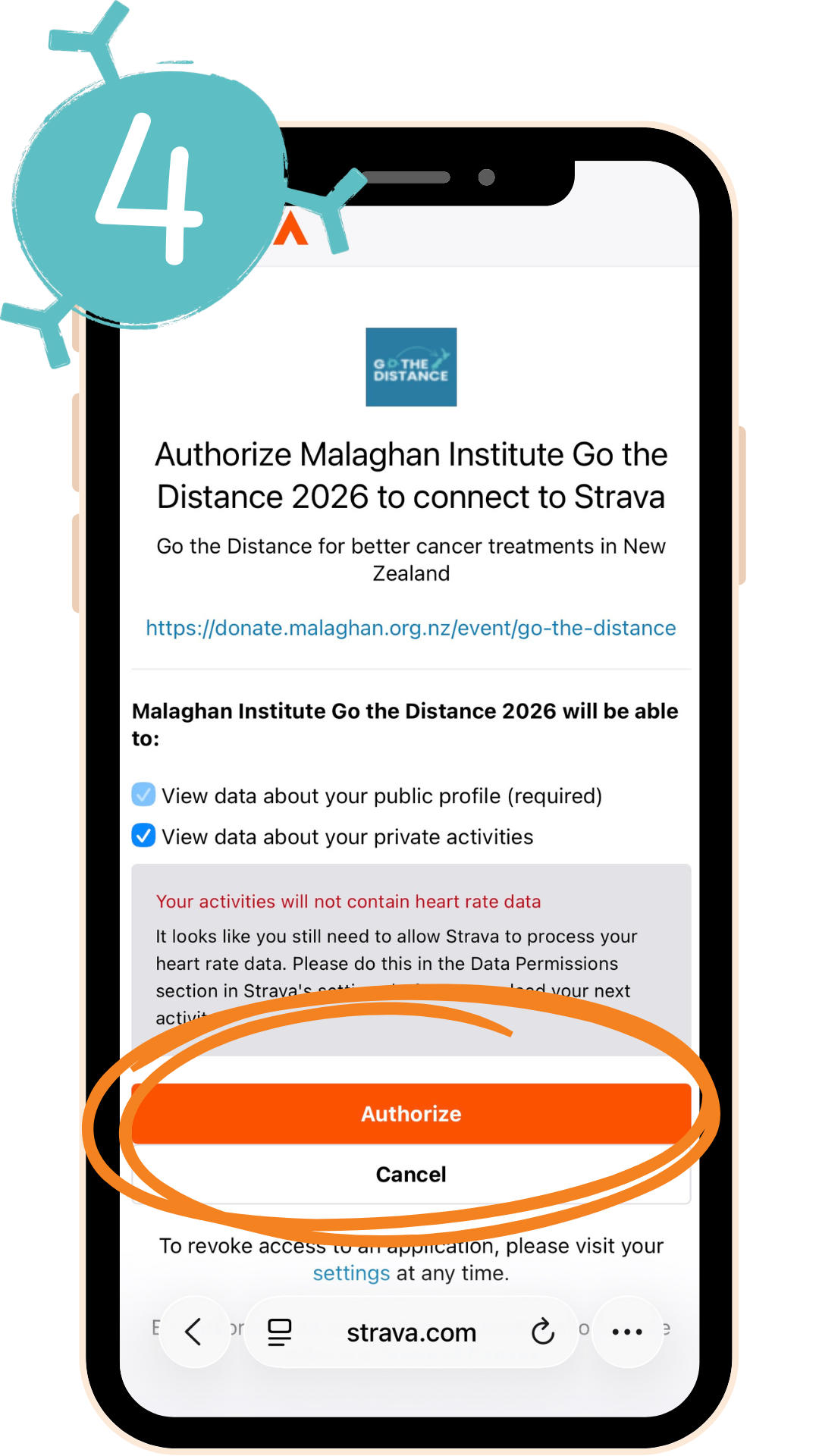 4. Logging in to your fitness app will take you to the app’s website where it will ask if you want to “Authorise Malaghan Institute Go the Distance 2026 to connect to [fitness app]”.