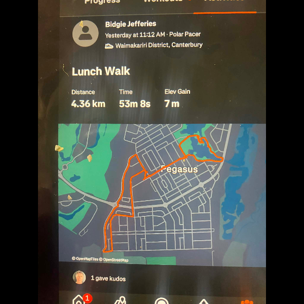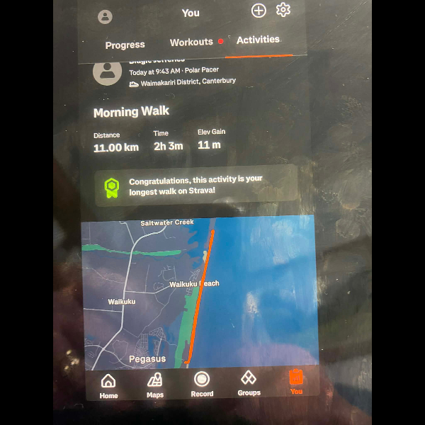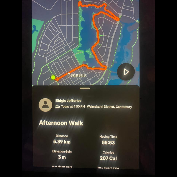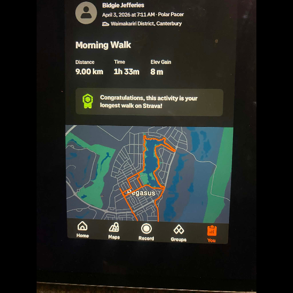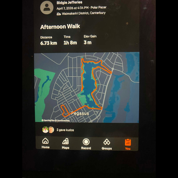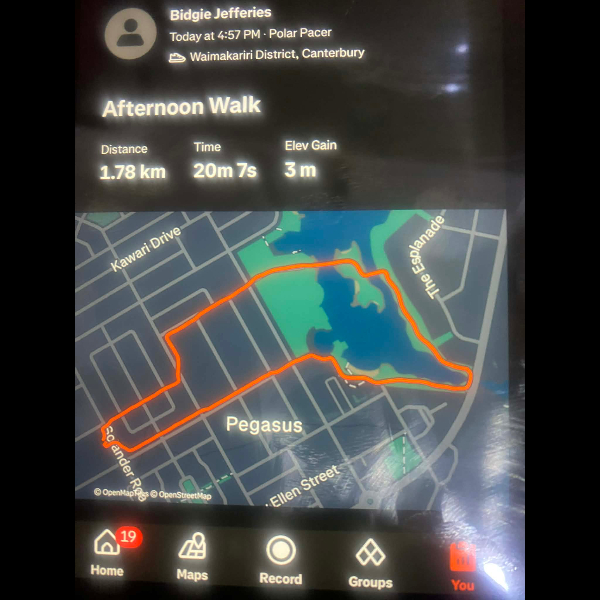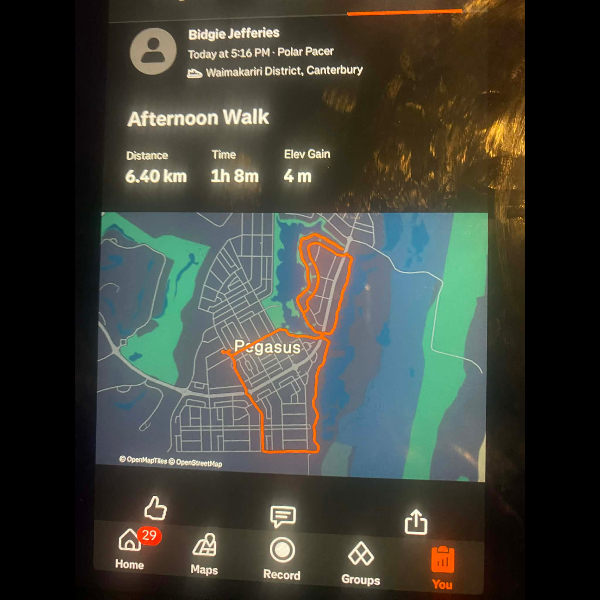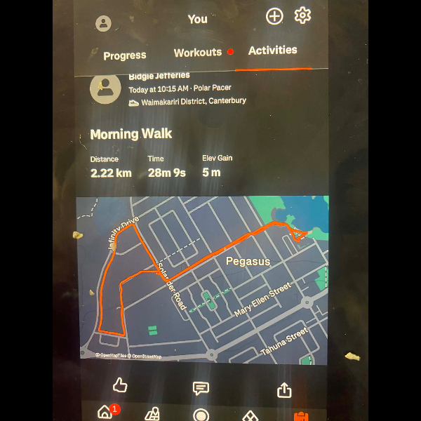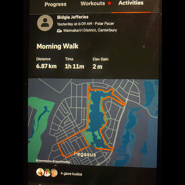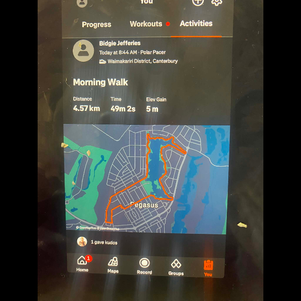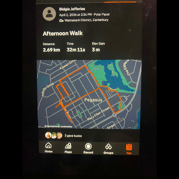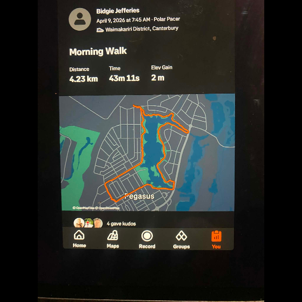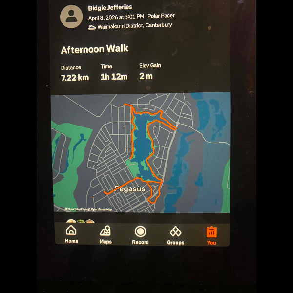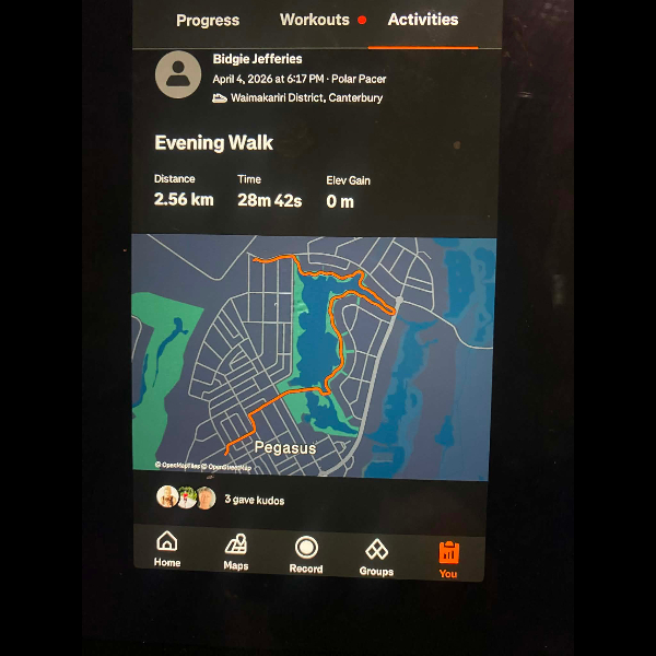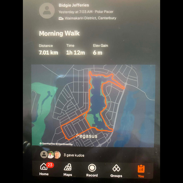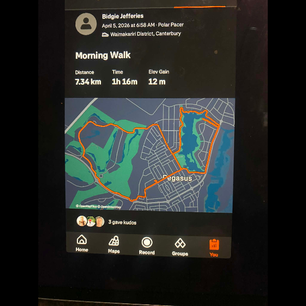Tuesday 21st Apr Day 21 726 km . Brisk day for walks and bike to Waikuku for coffee this morning . All the winter woolies on . Looked at my dash board tonight and showed 699. 86 km so went out for short walk to bring up 700 only to find when I logged it that todays kms hadn’t synced yet … Share
