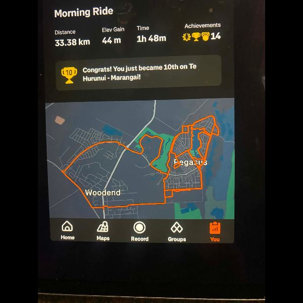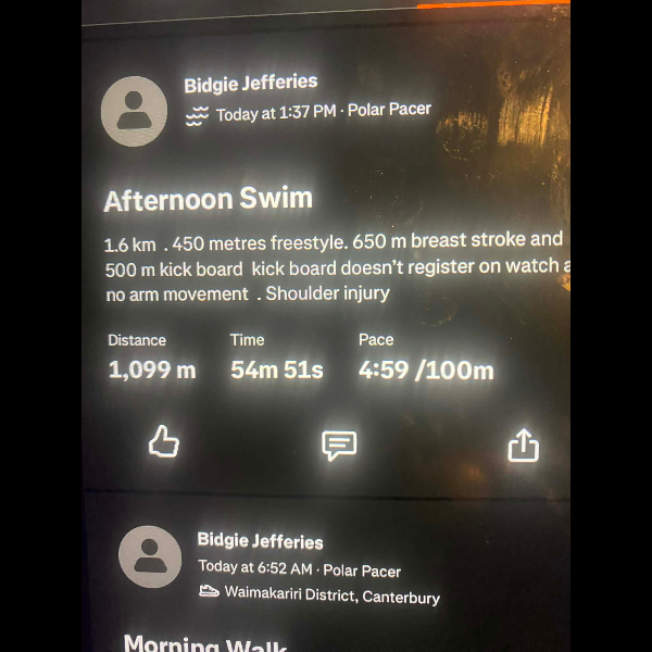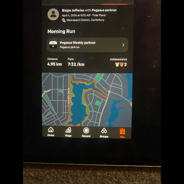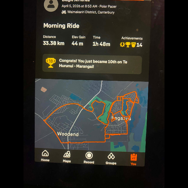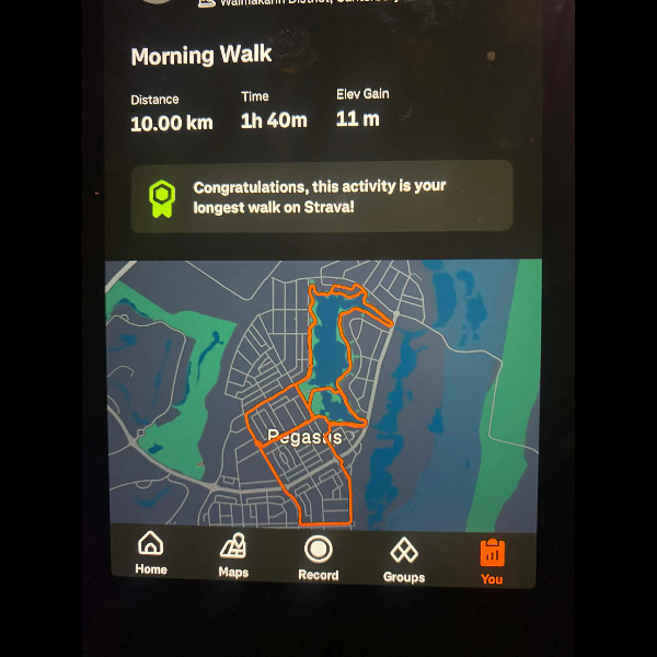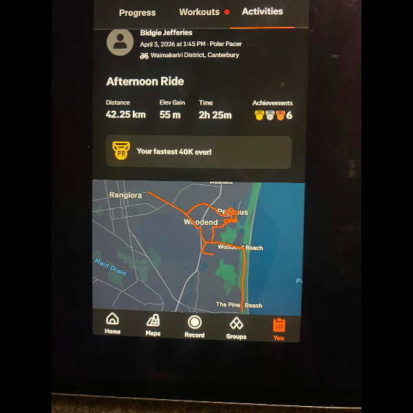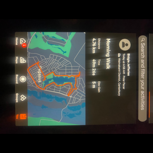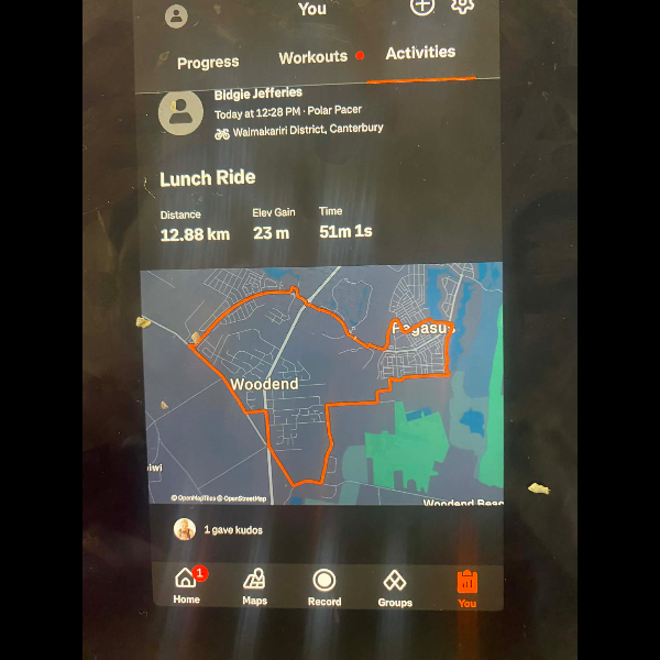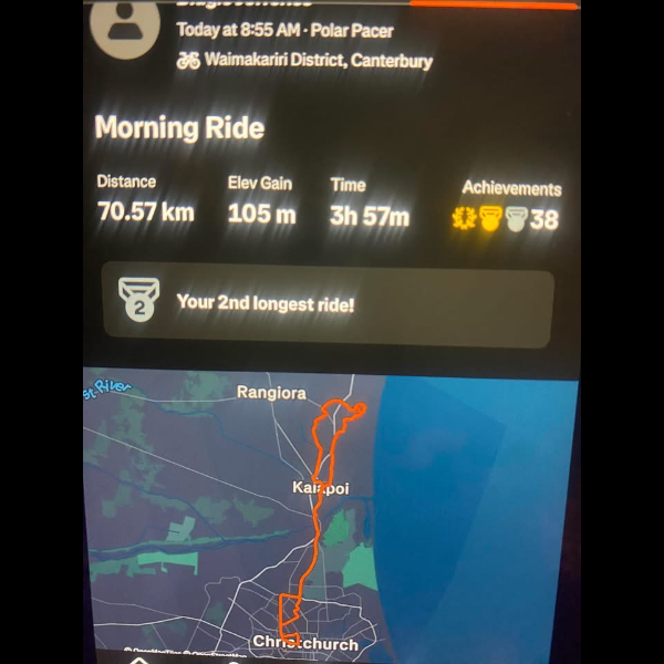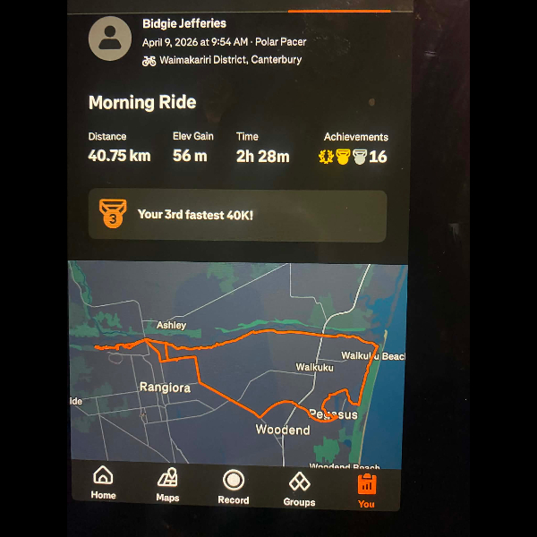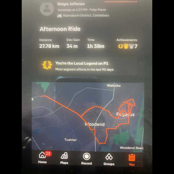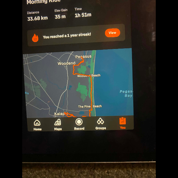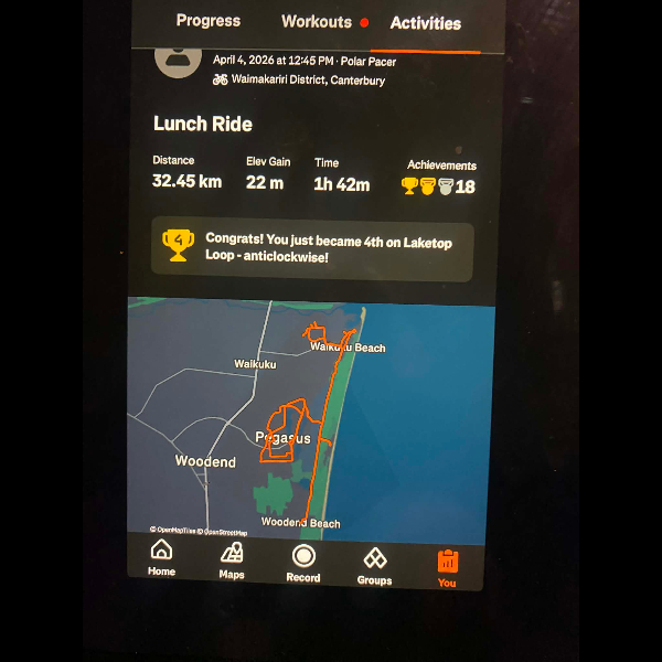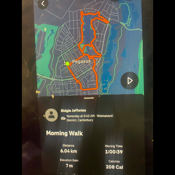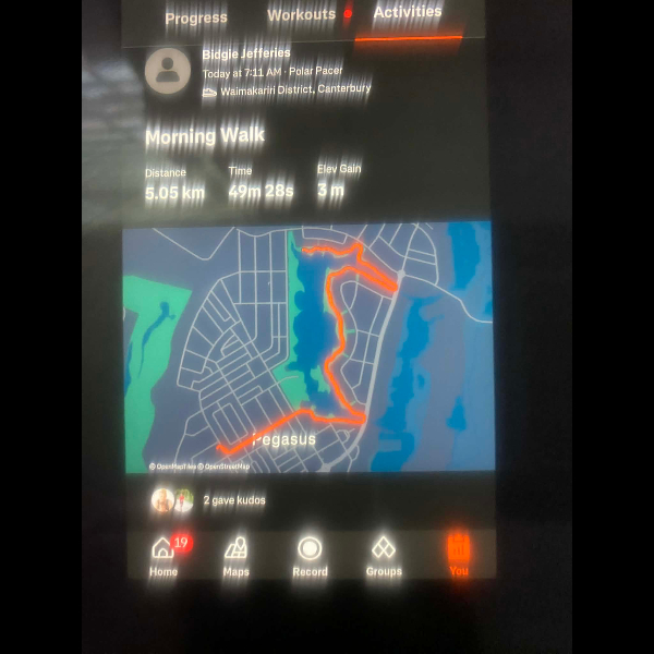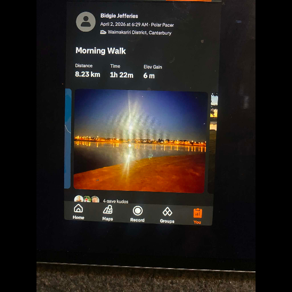 Tuesday 21st Apr Day 21 726 km . Brisk day for walks and bike to Waikuku for coffee this morning . All the winter woolies on . Looked at my dash board tonight and showed 699. 86 km so went out for short walk to bring up 700 only to find when I logged it that todays kms hadn’t synced yet … Share